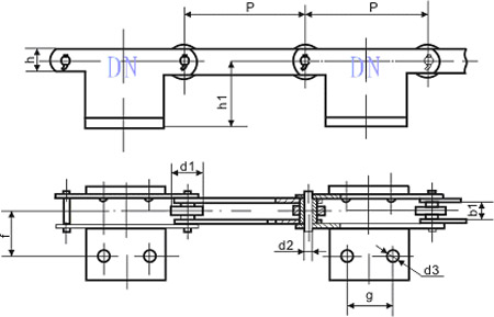 二、取料机链条(带导向板)安装尺寸与技术特性表: